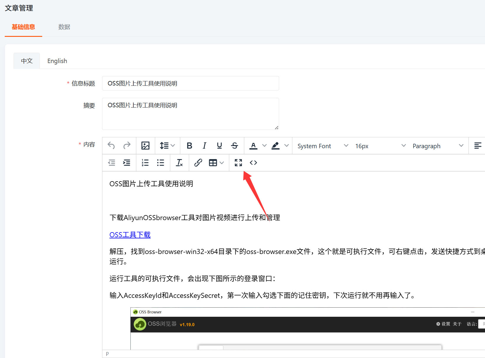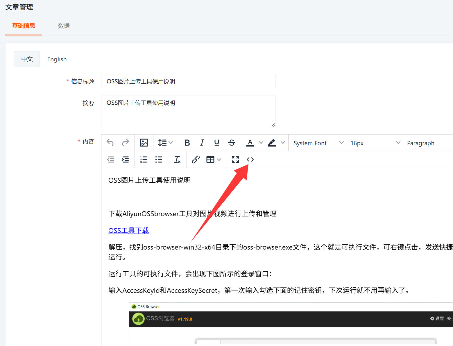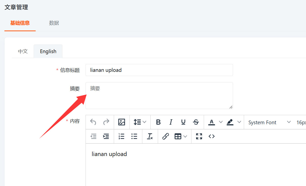 点击添加,写好中文标题、摘要(摘要是显示在首页的)、文字内容,英文标题文字内容。