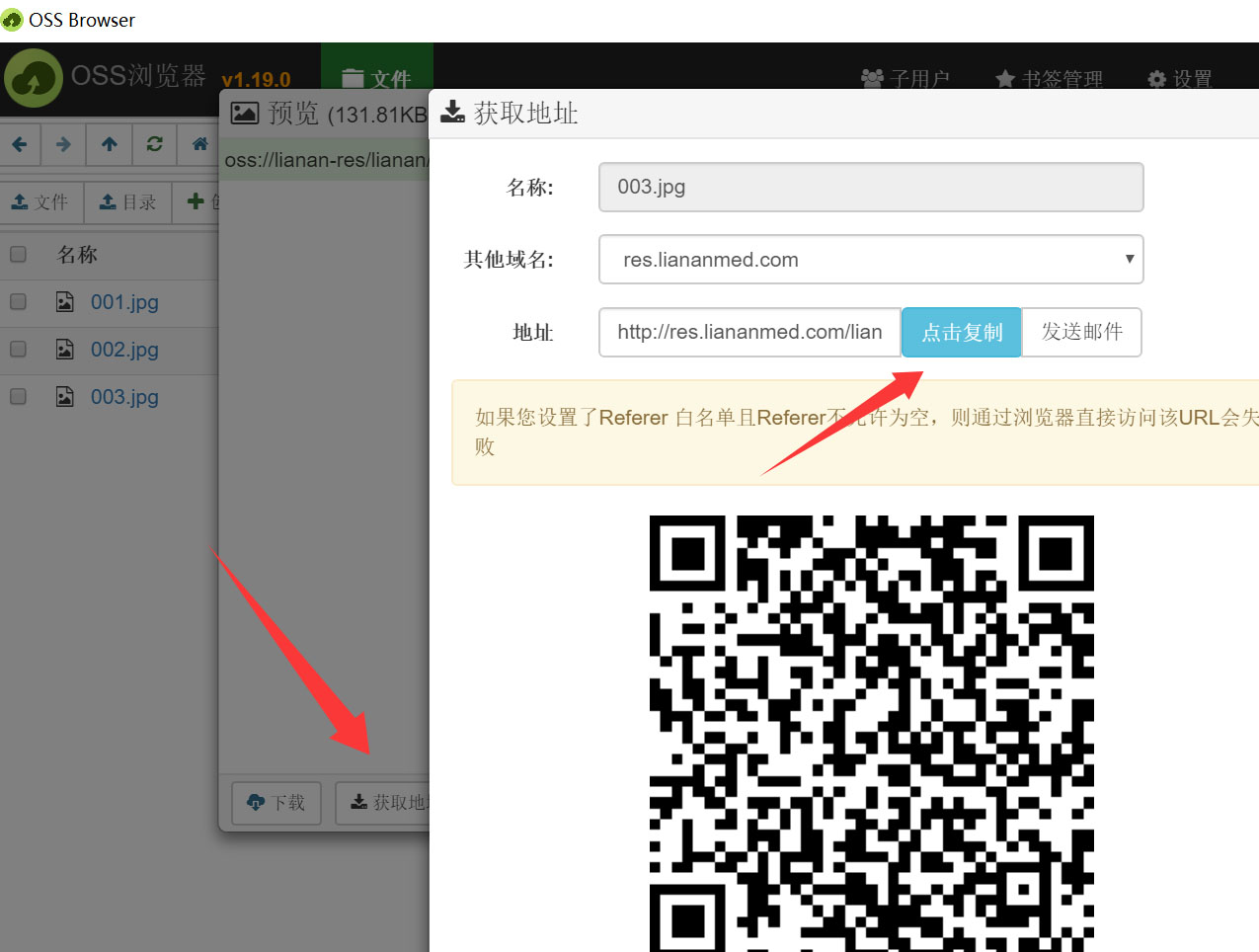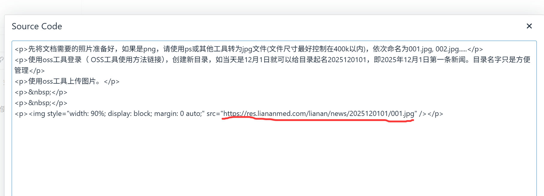 图片连接获取方法是在OSS工具中点击对应图片,在弹窗中点击获取地址,点击复制,将获取到的连接替换到上面图中src后面红线部分,点击Save键保存。