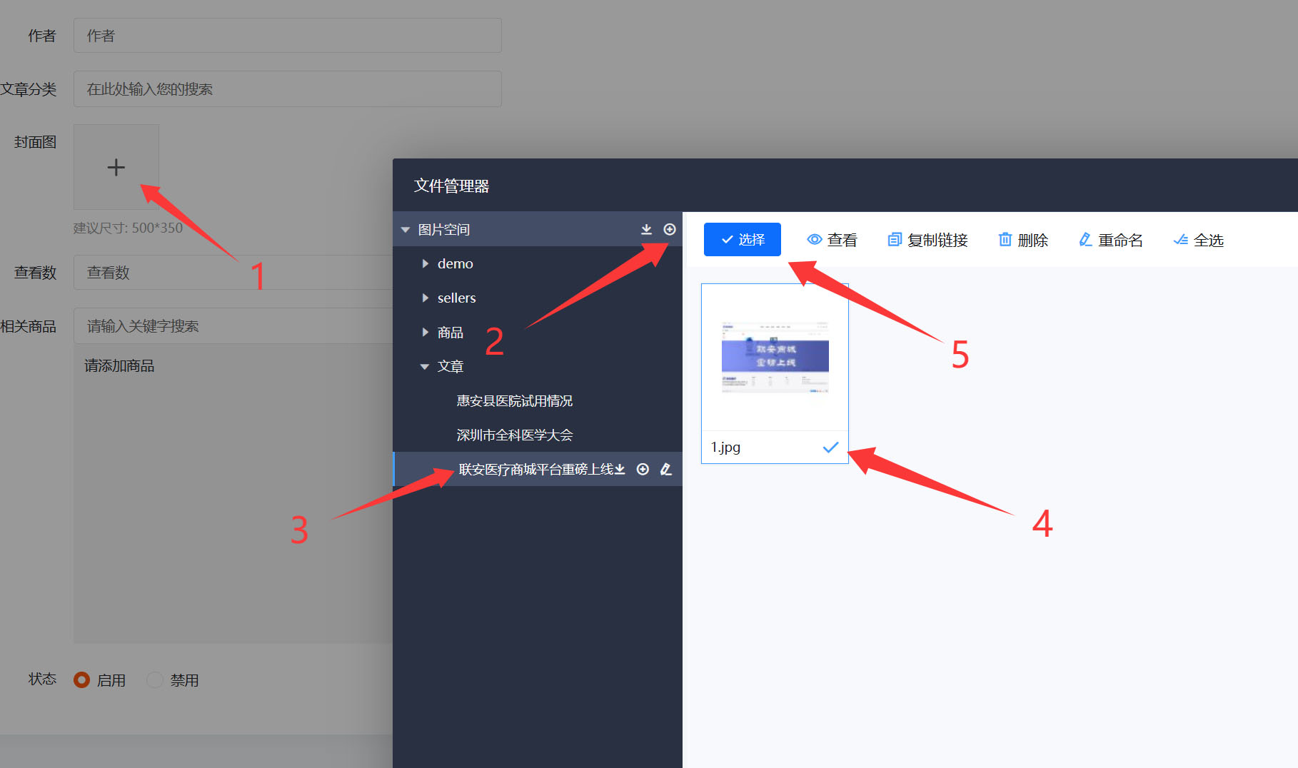 上传封面图, 点击加号图标,然后在文章的列表下面新建一个目录方便管理,将要设置为封面的图片上传到目录下,选中该图片,再点击选择,即可将该图片设置为封面。