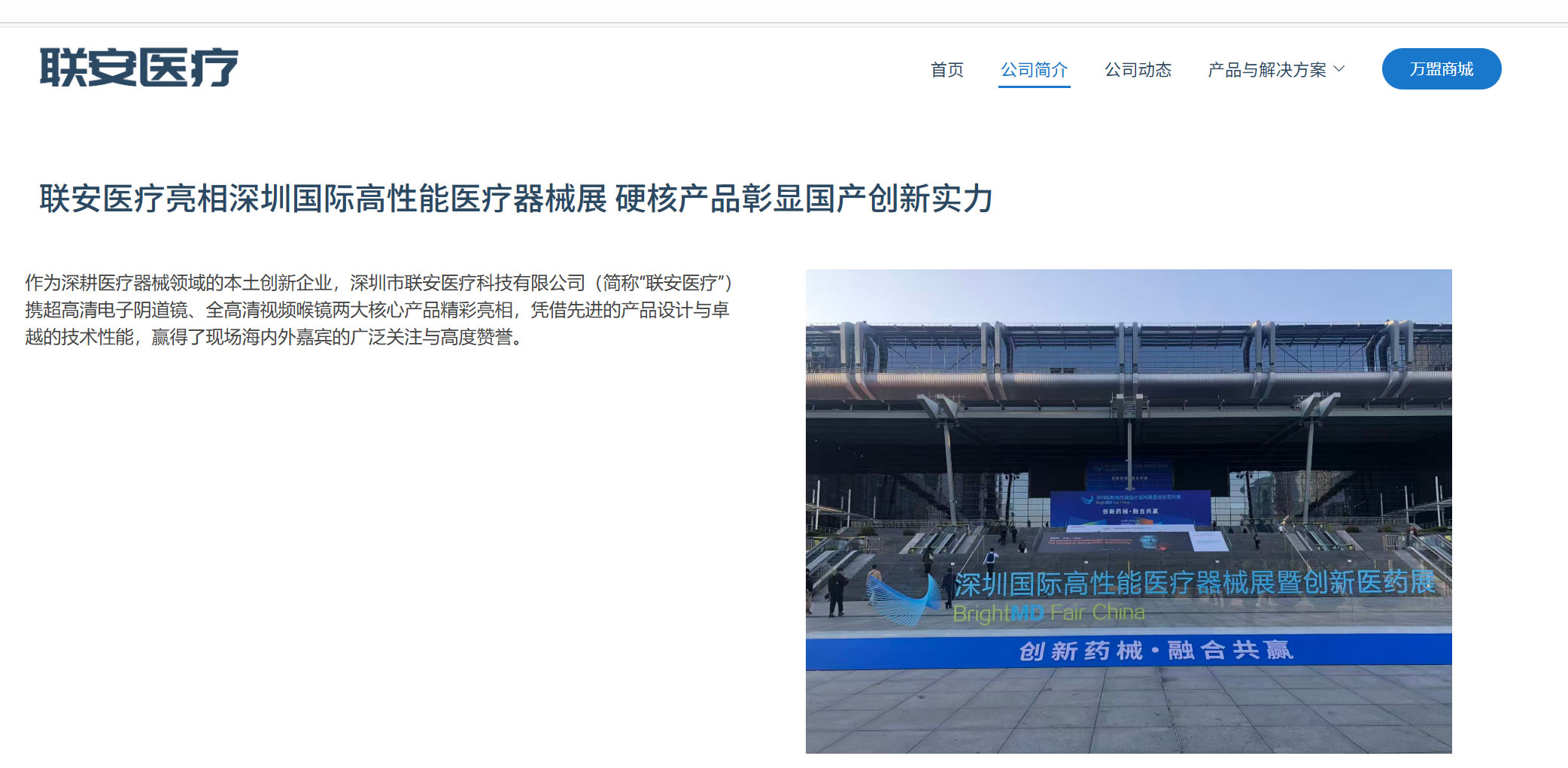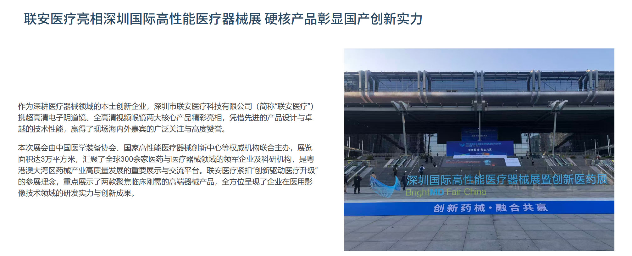 <p>作为深耕医疗器械领域的本土创新企业,深圳市联安医疗科技有限公司(简称“联安医疗”)携超高清电子阴道镜、全高清视频喉镜两大核心产品精彩亮相,凭借先进的产品设计与卓越的技术性能,赢得了现场海内外嘉宾的广泛关注与高度赞誉。</p>