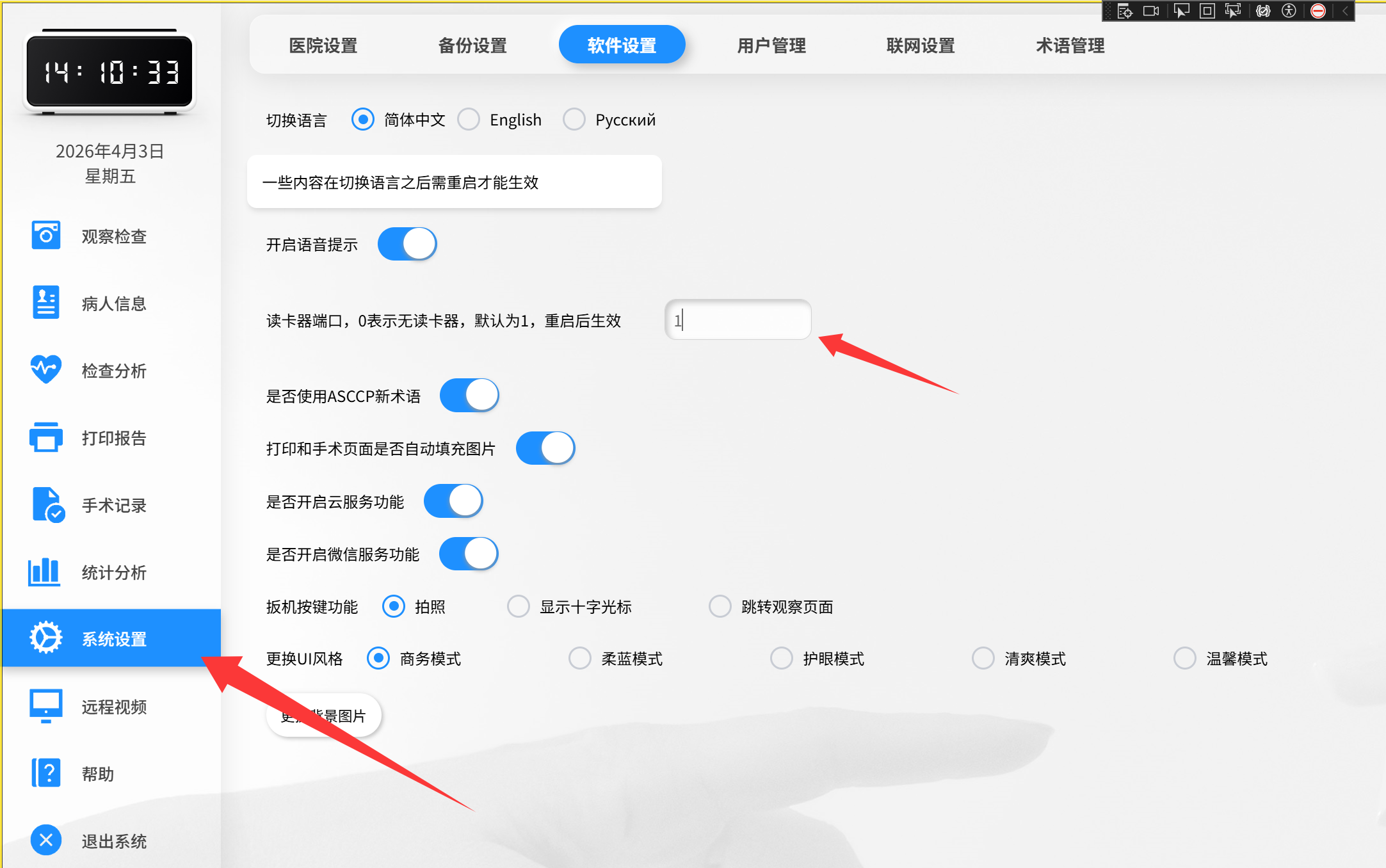 2. 运行软件,系统设置 -> 软件设置 -> 读卡器端口从0 改为1,如果原来是1则无需修改,退出软件,再次进入。