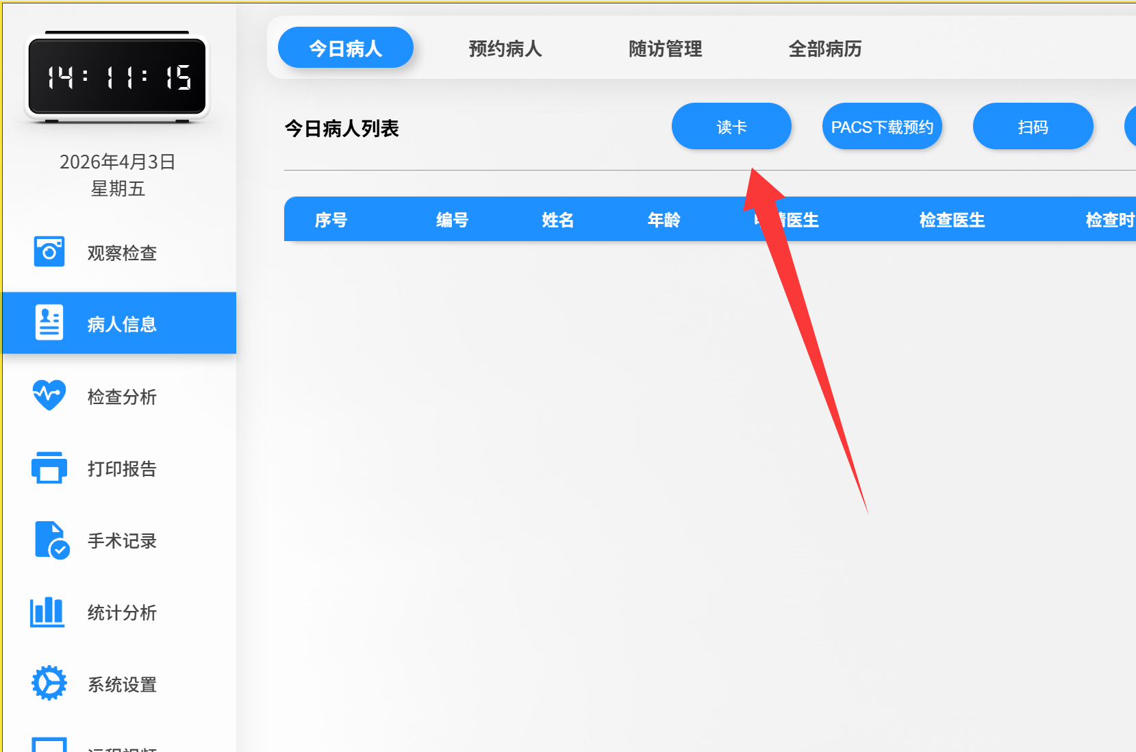 3. 病人信息->今日病人页面,读卡按钮为蓝色可用,此时将身份证放在读卡器上,点击读卡即可读取病人数据进入列表
